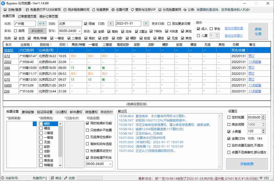 12306Bypass分流抢票软件,易操作强大的12306抢票软件,全程自动抢票,云识别验证码打码,多线程秒单、稳定捡漏,支持抢候补票、抢到票自动付款,支持多天、多车次、多席别、多乘客、短信提醒等功能。