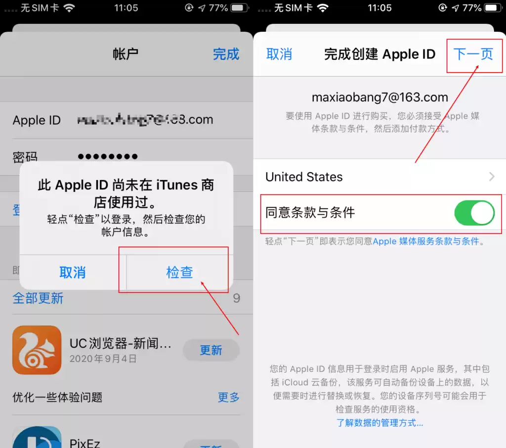 弹出此Apple ID尚未在iTunes商店使用过窗口,点击检查,然后选择同意条款与条件,下一页!