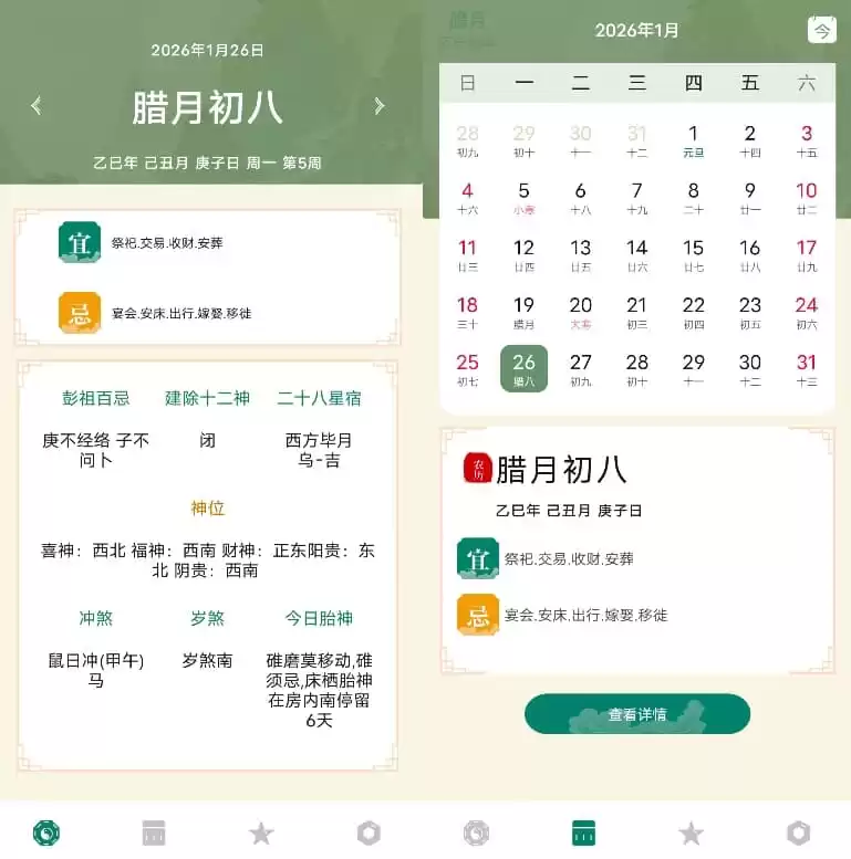 这款软件不仅包含了月历视图区和双历对照功能,还提供了丰富的传统文化内容和生活建议,帮助用户更好地理解和应用这些古老的历法。