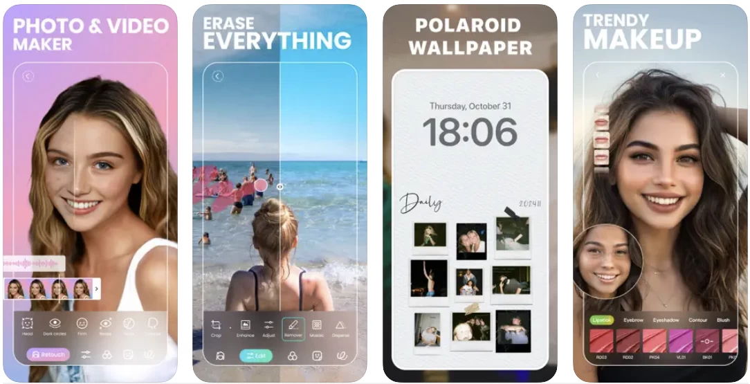 使用BeautyPlus AI照片编辑器和视频编辑器,您可以立即拍摄甜蜜的自拍照并修饰美丽的照片:去除粉刺和瑕疵,光滑皮肤,尝试换发器,美白牙齿,瘦脸和身材,尝试时尚妆容。